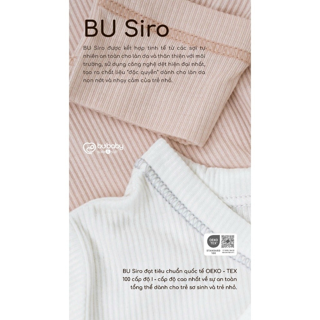 BU Siro được kết hợp tinh tế từ các sợi tự nhiên an toàn cho làn da và thân thiện với môi trường, sử dụng công nghệ dệt hiện đại nhất để tạo ra chất liệu dành riêng cho làn da non nớt và nhạy cảm của trẻ nhỏ.
