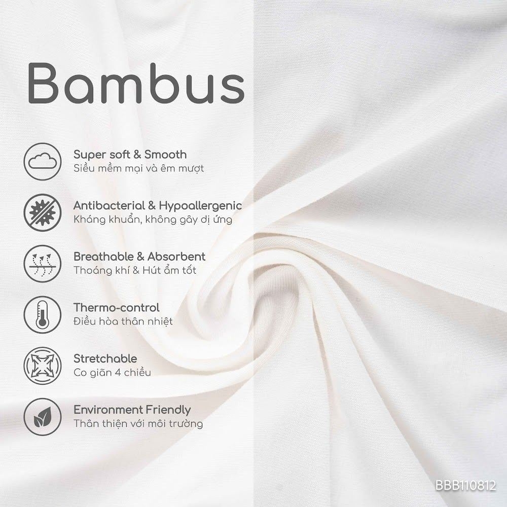 Bambus là chất liệu vải tre của BU được ứng dụng công nghệ Đan Mạch, siêu mềm mại và an toàn, lý tưởng cho da nhạy cảm. Đặc biệt, bambus có khả năng chống dị ứng, kháng khuẩn, kháng nấm tự nhiên; khả năng điều hòa thân nhiệt và chống tia UV.Sản phẩm của BU Baby tuyệt đối an toàn với trẻ nhỏ và thân thiện với môi trường. Sản phẩm đạt chứng nhận EOKO-TEX 100 (Class 1)