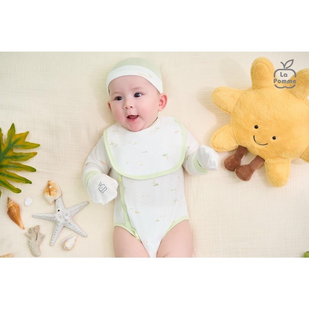 Mô tả chung Bộ dài tay cúc lệch La Pomme Mùa hè của bé nằm trong BST Sơ Sinh 2025 của La Pomme được thiết kế hài hòa giữa những tone màu pastel nhẹ nhàng tạo nên vẻ tinh khôi, trong trẻo cho bé yêu. Họa tiết thiên nhiên như rặng dừa xanh mát được tô điểm nhẹ nhàng trên nền vải gợi lên khung cảnh bờ biển trong lành và những ngày hè dịu êm. Sản phẩm được thiết kế và sản xuất tại Việt Nam - độc quyền bởi thương hiệu quần áo trẻ em, đồ sơ sinh La Pomme, sở hữu đặc tính mềm mịn, an toàn cho bé, phù hợp trong tủ đồ quần áo của bé trai và bé gái. Chi tiết sản phẩm: Bộ dài tay cúc lệch La Pomme Mùa hè của bé được thiết kế với cúc bấm êm từ Nhật Bản, tiện lợi cho mẹ thay bỉm tã, mặc đồ cho bé. Tính ứng dụng cao - bé mặc không bị ôm sát gây khó chịu, không bị nóng bí da… Toàn bộ sản phẩm của La Pomme đều được kiểm nghiệm và cấp chứng nhận Hợp chuẩn, Hợp quy theo quy định tại QCVN 01:2017/BCT của Bộ Công Thương – Sản phẩm an toàn với trẻ sơ sinh và trẻ nhỏ. Thông tin chất liệu: Petit Soyeu Sở hữu tỉ lệ vàng của các loại sợi tự nhiên, chất liệu Petit kinh điển được nâng cấp trong công nghệ dệt với mật độ sợi 50s tạo bề mặt vải mượt, khít mịn như lụa. Kết cấu sợi đặc biệt tạo môi trường hoàn hảo giúp da bé hít thở, cảm giác trên da mát nhẹ “ôm" làn da bé và hoàn toàn không gây kích ứng da, kể cả bé sinh non có làn da nhạy cảm nhất. Hợp chất sinh học tự nhiên “Bamboo Kun” ngăn chặn tối đa sự phát triển của vi khuẩn gây mùi khó chịu. Cách giặt và bảo quản: Có thể giặt máy, lộn trái mặt vải và bảo quản nơi khô ráo thoáng mát. Tránh phơi trực tiếp dưới ánh nắng mặt trời. Hướng dẫn chọn size: Ba Mẹ chọn size theo bảng size có sẵn của La Pomme.