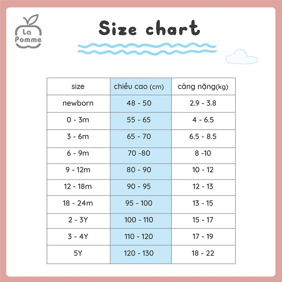 Bộ cộc tay La Pomme Donut nằm trong BST Xuân Hè 2025 của La Pomme được phối màu tinh tế với tone màu xanh, hồng phù hợp cho cả bé trai và bé gái. Ghi điểm với chiếc bánh Donut nhỏ xinh trước ngực, mang đến nét đáng yêu, vui nhộn, giúp bé thêm phần nổi bật. Sản phẩm được thiết kế và sản xuất tại Việt Nam - độc quyền bởi thương hiệu quần áo trẻ em, đồ sơ sinh La Pomme, sở hữu đặc tính mềm mịn, an toàn cho bé sơ sinh. ☁️ HƯỚNG DẪN CHỌN SIZE : - Size Newborn ( Viết tắt NB: chiều cao 48-50cm ~ Cân nặng 2.9-3.8 kg - Size 0-3M ( Viết tắt 0M) : Chiều cao 55-65cm ~ Cân nặng 4-6,5 kg - Size 3-6M ( Viết tắt 3M ) : Chiều cao 65-70 cm ~ Cân nặng 6.5-8.5 kg - Size 6-9M ( Viết tắt 6M ) : Chiều cao 70-80 cm ~ Cân nặng 8-10 kg - Size 9-12M ( Viết tắt 9M) : Chiều cao 80-90 cm ~ Cân nặng 10-12 kg - Size 12-18M ( Viết tắt 12M) : Chiều cao 90-95 cm ~ Cân nặng 12-13 kg - Size 18-24M ( Viết tắt 2Y): Chiều cao 95-100 cm ~ Cân nặng 13-15 kg - Size 2-3Y ( Viết tắt 3Y ) : Chiều cao 100-110 cm ~ Cân nặng 15-17 kg - Size 3-4Y ( Viết tắt 4Y): Chiều cao 110-120 cm ~ Cân nặng 17-19 kg - Size 4- 5Y ( Viết tắt 5Y) : Chiều cao 120-130 cm ~ Cân nặng 18-22 kg ☁️ CÁCH MUA NHANH: Các mẹ vào shop LAPOMME gõ size của bé ví dụ : 0M 3M 2Y 4Y ... để chọn đồ nhanh cho bé hoặc vào album size để đặt hàng nhanh nhé. ☁️ HƯỚNG DẪN GIẶT / BẢO QUẢN - Nên dùng bột giặt và nước xả vải chuyên dụng cho quần áo trẻ nhỏ - Ưu tiên giặt tay, giặt máy nên dùng túi giặt cho quần áo trẻ nhỏ - Không giặt chung với đồ người lớn - Không sấy khô, không dùng chất tẩy rửa - Phơi dưới ánh nắng nhẹ, nơi khô thoáng - Ủi ở mặt trái với mức nhiệt thấp #LAPOMME #lapomme #lapommehanoi #lapommevietnam #La_pomme
